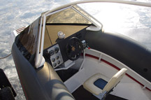 Пост управления размещен в носовой части. Такая схема расположения наиболее удобна при компоновке катера для туризма, дайвинга, перевозки пассажиров. За водителем образуется единое пространство, где удобно разместить группу людей или груз. Стекло хорошо защищает весь экипаж от ветра и брызг. Так же это дает отличный обзор рулевому, что повышает большую безопасность при быстром движении.