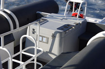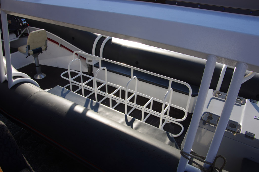 Рундуки расположены вдоль каждого борта. Крышки рундуков обшиты тканью ПВХ с мягким наполнителем под ней и выполняют роль сидений для пассажиров на раждом их них могут разместиться до пяти пассажиров. Еще два пассажирских сиденья расположены по бокам моторного отсека. Вдоль диаметральной плоскости, по центру, расположена стойка для восьми баллонов. Так же дополнительные баллоны можно укладывать в рундуки. Стойка крепится к палубе болтами и ее можно снять при необходимости.