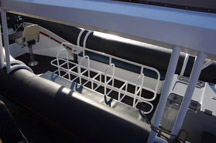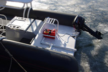 Корпус и крышка моторного отсека выполнены из стеклопластика. Фиксируются на палубе на защелках и могут быть легко сняты для доступа к мотору. За транцем установлен просторный кринолин. На кринолине размещен транец для аварийного двигателя, водолазный трап, крепление для топливного бака. Основной топливный бак расположен под палубой, имеет объем 180л. (может быть увеличен по согласованию с заказчиком). Стенки выполнены из листов сплава АМГ5 (алюминий) толщиной 4мм. Полость бака оборудована продольными и поперечными успокоителями.