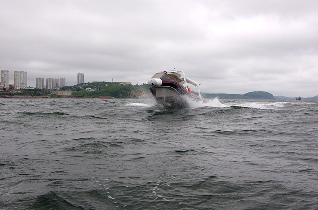 Алюминиевый корпус с поперечным реданом. Оригинальные обводы корпуса обеспечивают быстрый переход в режим глиссирования. Высокий нос и оригинальные обводы обеспечивают «мягкое» преодоление высоких волн. Катер мягко, без ударов, движется при волнении, что позволило разместить пост управления в носовой части.